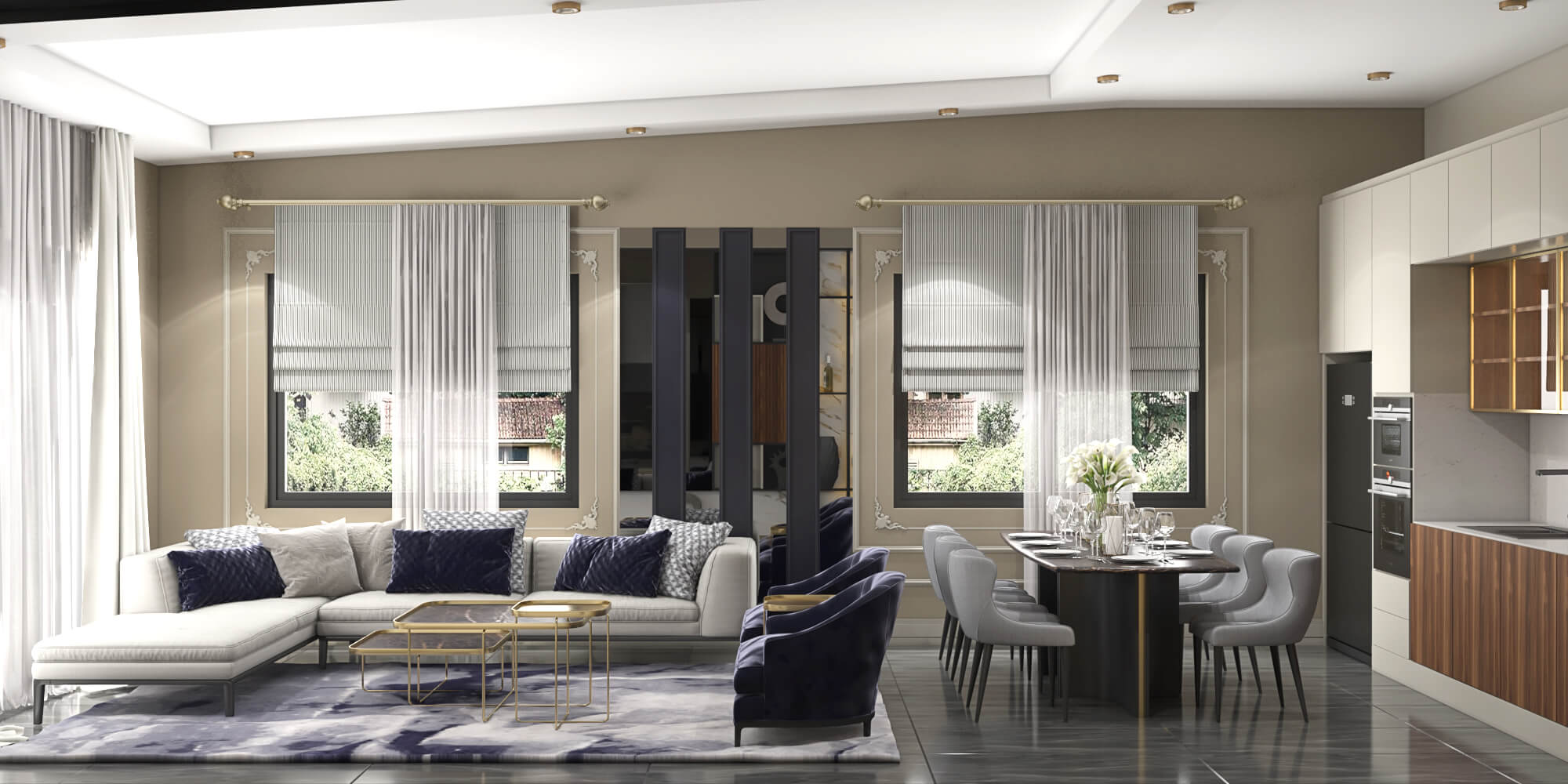 Working on the interior of the gastrobar, we sought to tell this story through design. We used the principle of a modern museum, in which the interior is just a background for the exposition, and a special light reveals the beauty and shape of objects. The decoration is simple, even a little ascetic. The main texture is concrete: a bar counter, self-leveling floor and decorative plaster on the walls. Part of the walls is decorated with concrete teeth. Against the background of a neutral finish, every detail of the interior looks more expressive. Carved decorative doors, brass lamps, natural wood, leather in the finishes of chairs.