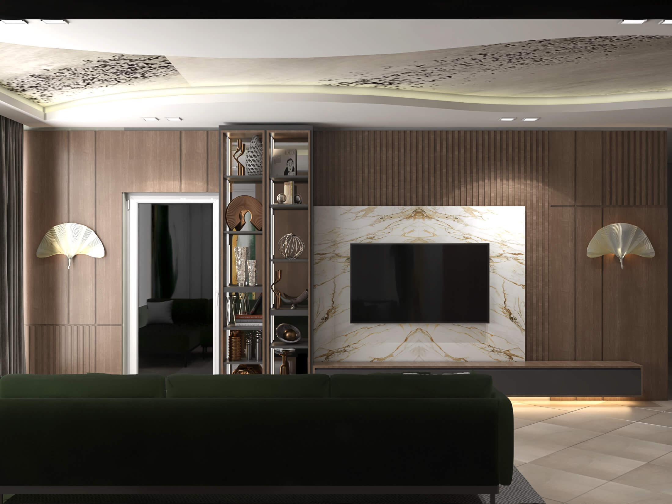 Working on the interior of the gastrobar, we sought to tell this story through design. We used the principle of a modern museum, in which the interior is just a background for the exposition, and a special light reveals the beauty and shape of objects. The decoration is simple, even a little ascetic. The main texture is concrete: a bar counter, self-leveling floor and decorative plaster on the walls. Part of the walls is decorated with concrete teeth. Against the background of a neutral finish, every detail of the interior looks more expressive. Carved decorative doors, brass lamps, natural wood, leather in the finishes of chairs.